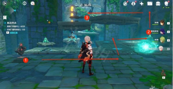 3.隨後我們來到第二處地點,我們需要先將1號位置的機關關閉,隨後前往2號機關處,將風場的方向設置為朝上的方向,隨後將3號位置的機關風場朝向也設置為朝上的方向。