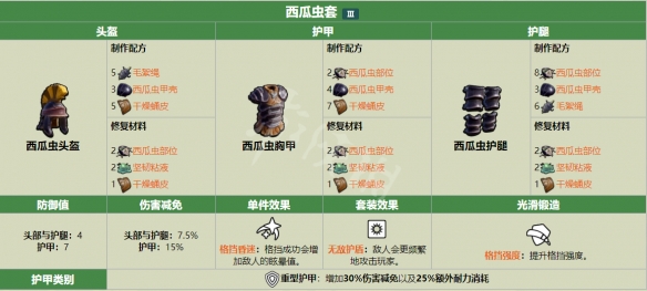 胸甲製作配方需要2個西瓜蟲部位,4個西瓜蟲甲殼和7個乾燥蛹皮。修復材料需要2個西瓜蟲部位,2個堅韌粘液和1個乾燥蛹皮。