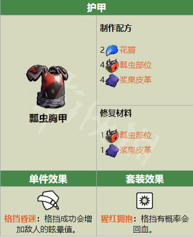 瓢蟲胸甲製作配方是2個花瓣、4個瓢蟲部位、4個漿果皮革,修復材料為1個瓢蟲部位、1個漿果皮革,單件效果是格擋昏迷:格擋成功會增加敵人的眩暈值,套裝效果是猩紅擁抱:格擋有概率會回血。