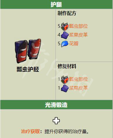 瓢蟲護脛製作配方是5個瓢蟲部位、4個漿果皮革、5個花瓣,修復材料為1個瓢蟲部位、1個漿果皮革,光滑鍛造的效果為治療獲取:提升你獲得的治療量。