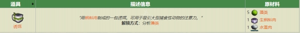 玩家需要通過分析藻類才能解鎖誘餌,誘餌的原材料為5個藻類、1個生蝌蚪肉、1個水蚤肉。