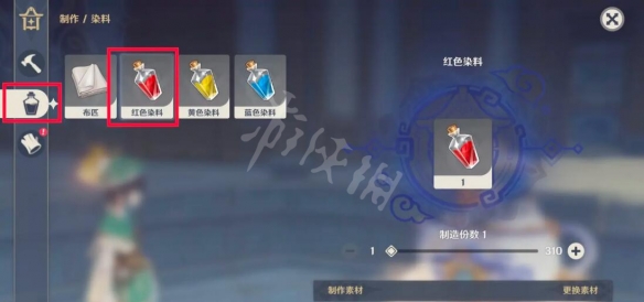 選擇左側邊欄第二個染料,紅色染料,點擊右下角製作。