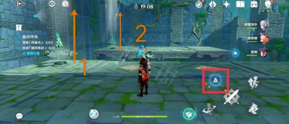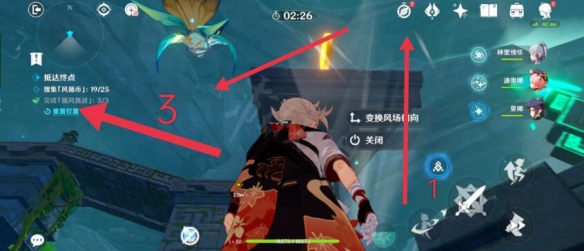 1.首先點擊圖中紅框中控風按鈕,關閉所有風場。依次將圖中的1、2處風場方向朝上並開啟。再次點擊控風按鈕,開啟所有風場。開啟挑戰,如圖所示逆時針完成挑戰。