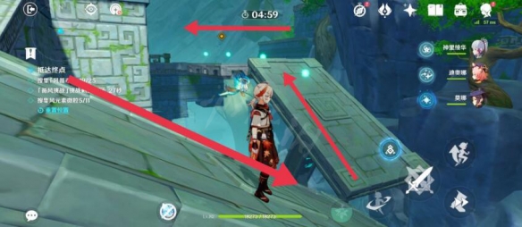 6.首先點擊控風按鈕,關閉所有風場。向前行走,來到此處並下落到前方平台。到達平台後,點擊控風按鈕,開啟風場,平台上升。如圖箭頭所示所示回頭拿風循幣。繼續向任務點前進。
