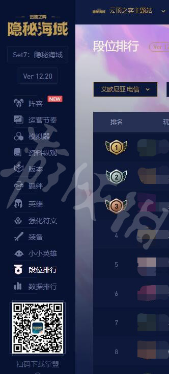 3、進入雲頂之弈主題站後,看左邊的菜單欄,在倒數第二個就是段位排行,點擊它就能看到雲頂之巔實時排名了。