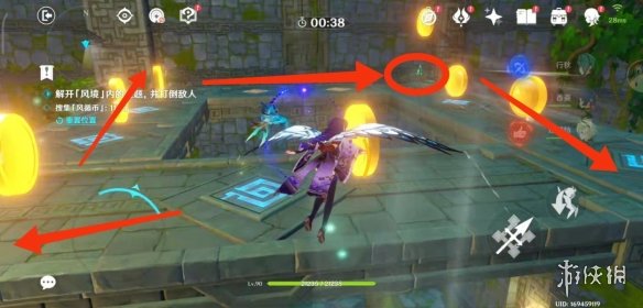 7.走到這個風場機關處 變換風場朝向使往上吹。如果沒動靜我們需要點擊開啟。吃完這個風場上面倆個金幣之後,我們把這個平台所有能看見的金幣拿完即可開啟挑戰。