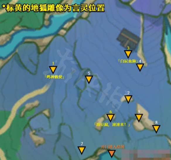 天狐雕像解謎提示文本:「鎮物以言靈封印至此。雖然我希望封印不要有解開的一天,雖然你也已經多年不曾有音訊。但如果一定要解開封印,實行大祓的話,那希望解開封印的人是你。第三句言靈是以前你常說的話。如果是小生的繼任者的話,要解開言靈之前,還有這麼一個步驟。御靈有四魂,巴有三重。據此我留下了三名式神看守。當它們匯聚在一起時,才能繼續。雖然這重鎖沒什麼用,但要擋住沒什麼能耐的賊**抵是綽有餘。」