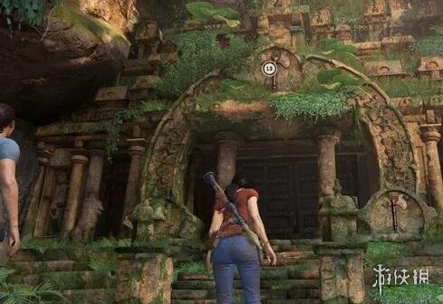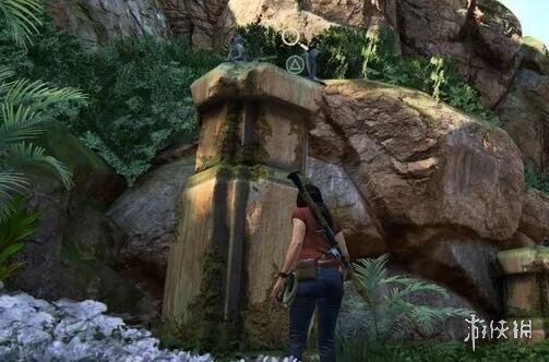 沿著小路一直往前走,來到一個有很多猴子的地方,找到下圖所示的柱子並與其互動,注意此時一定要確保娜汀跟在身邊,否則會錯過。