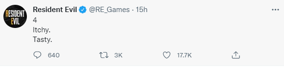「Itchy」和「Tasty」最早出現在《生化危機1》「管理員日記」中,是管理員被感染後記錄下來的,讓人毛骨悚然。而「4」則是在暗示生化系列第四部作品?但為何要引用初代游戲內容,來暗示《生化危機4》將重製的消息,讓人不能理解。或許官方是想說《生化危機4》很美味,讓人渴望?這條推特也引起了許多玩家的注意。