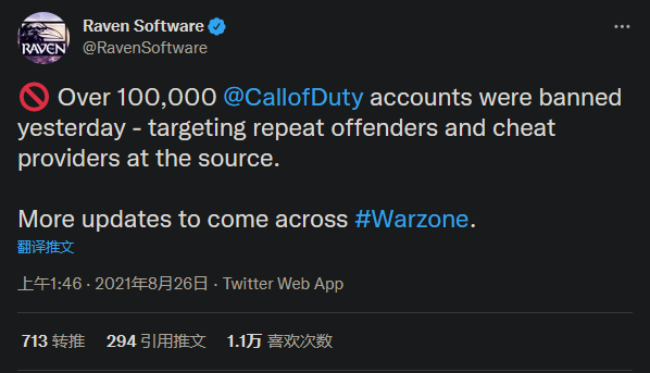 該工作室在推特上確認了這一消息,稱他們已封禁了超過 10 萬個賬號,並且專門針對「重復作弊和供應作弊軟體的人」。