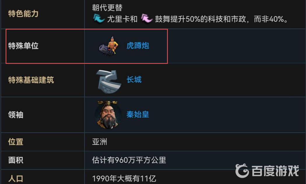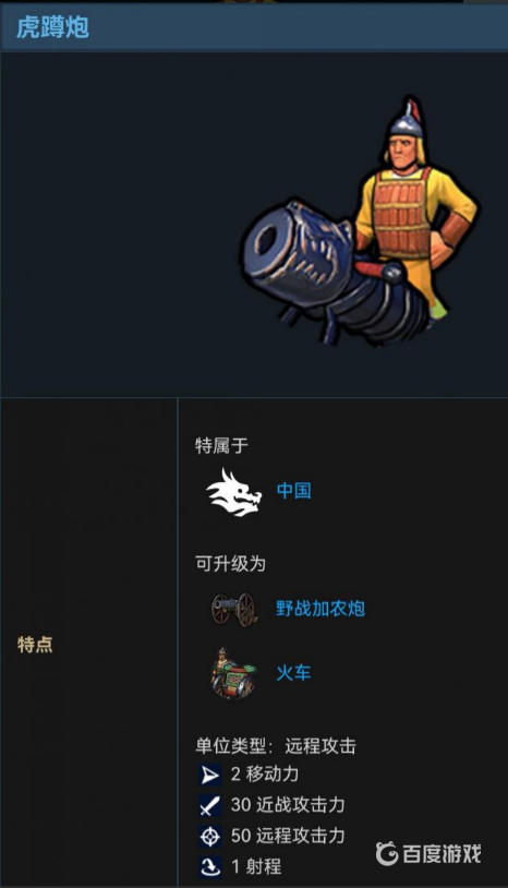 首頁 文明6 問答 文明6秦始皇特殊兵種全稱是什麼? 2022-10-24 特殊兵種虎蹲炮。虎蹲炮可以升級為野戰加農炮,最終可以升級為火車屬於遠程攻擊,虎蹲炮的屬性:移動力2,近戰攻擊力30,遠程攻擊力50,射程1。