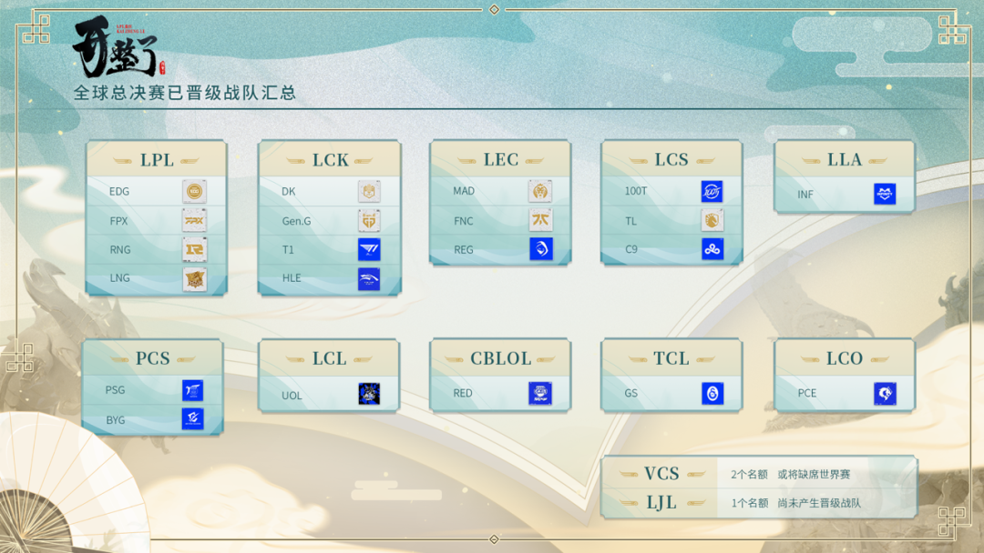 截止目前,已有21支戰隊晉級全球總決賽。越南VCS賽區,或因為疫情原因,採取和MSI同樣的決定,或將放棄參賽(一共2個名額)。日本LJL賽區,目前晉級戰隊尚未最終產生(一共1個名額)。