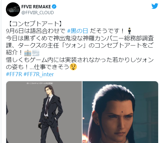 9月6日在日語諧音成為「黑色之日」,《最終幻想7:重製版》官方則順勢放出了遊戲的開發原圖,並未在遊戲中實裝,是來自神羅公司的高級幹部,總務部調查課、塔克斯的主人曾。