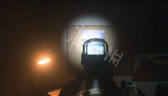 某間房屋中,三腳架上的獵槍通過絆線連接到了門上,從窗戶翻進去,解除陷阱拿到獵槍,然後上樓。
