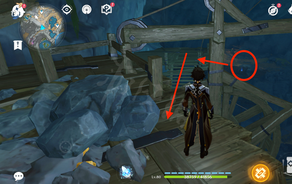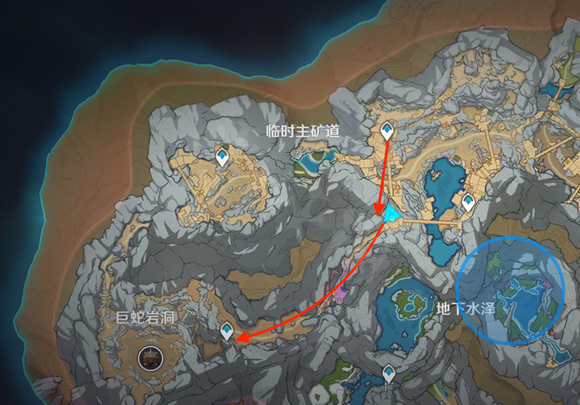 2、按照上圖路線行走,從臨時主礦道右側的傳送點向上爬,到達圖中位置後,轉身進入巨蛇岩洞甬道。