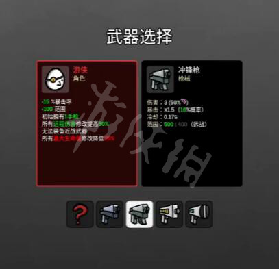 游俠的角色特性就是無法裝備使用任何的近戰武器,且所有最大生命值效果的屬性修改降低5%。所以游俠開局可以直接選擇沖鋒槍,後期更換成加特林。