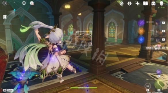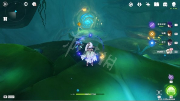 立馬往地圖的東北方向下跳,拾取原石松脂(若沒有及時拾取原石松脂,水會上漲,可利用四葉印和移動平台,返回上層平台傳送回去,再按上圖傳送回來,拾取原石松脂)