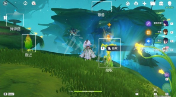 往地圖的南方向看,拾取原石松脂,靠近圖中指引,利用彈彈菇,前往清理蕈獸