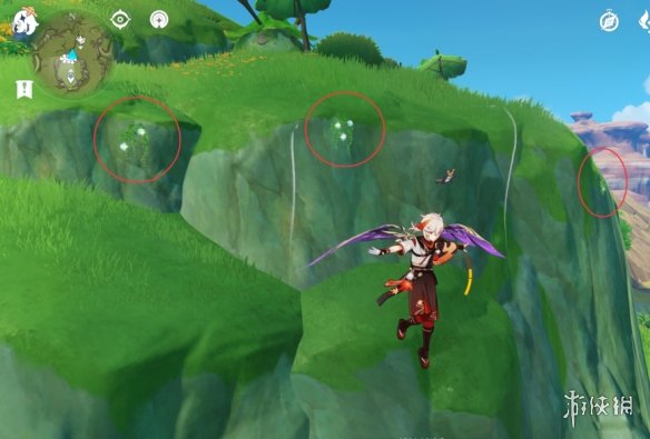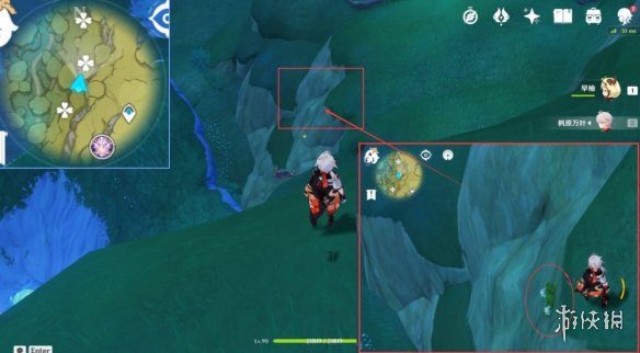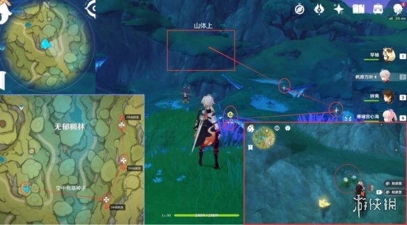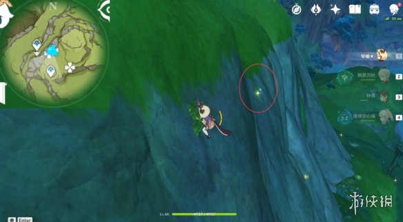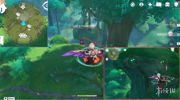 我們來到無郁稠林左下角的傳送點,朝著地圖的東方向對面山體的位置飛,空中有草種子可以拉一下,在山體上就有兩朵劫波蓮。