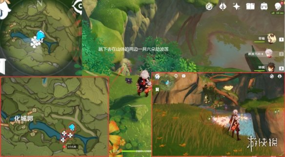 我們來到化城郭右邊的七天神像,朝著地圖的西南方向跳下去,在瀑布上方左右兩邊一共六朵劫波蓮。