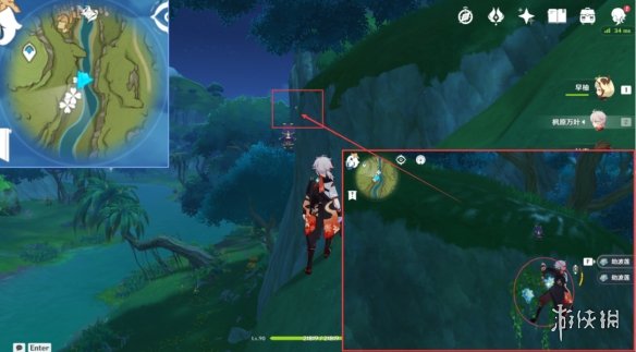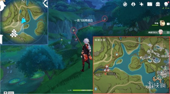 我們來到須彌城最左邊的傳送點,朝著地圖的西南方向一直走,走到瀑布的位置。