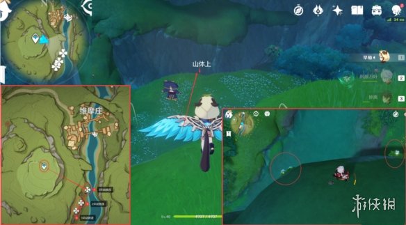 我們來到維摩庄左下角的傳送點,朝著地圖東方向一直飛,飛到下面的懸崖處就有三朵劫波蓮。