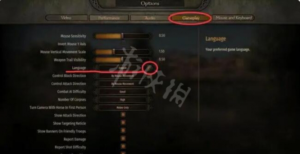 選擇第四個欄目“Gameplay”。然後找到第五行“Language”。點擊這一行右邊的小箭頭選擇語言。