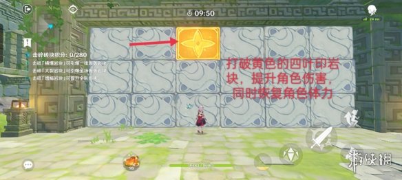 打破黃色的四葉印岩塊,提升角色傷害,並且恢復角色體力值。