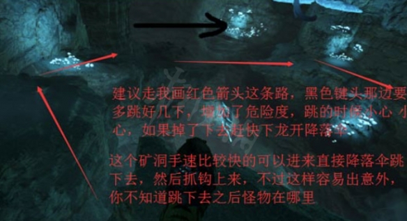 1、潛水過後就能看到整個洞穴的全貌了,中間是一個大坑,神器就在底下,左側,沿著懸崖邊緣一路下去,中間有幾個坑,小心點跳 過去即可。