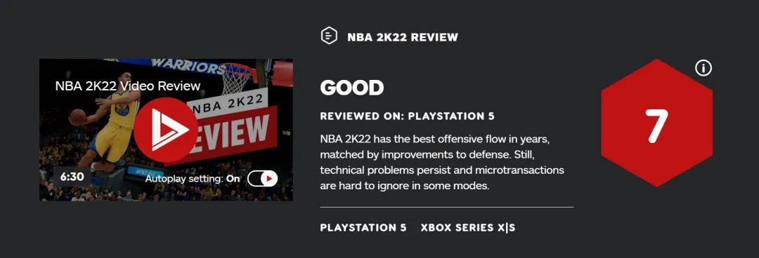 籃球力作《NBA 2K22》已於9月10日正式發售,今日(9月15日),IGN為其打出7分,IGN表示,本作還行,《NBA 2K22》的進攻端相比防守端的提升來說是這幾代里最流暢的。但是游戲依舊有很多的技術性問題,同時在某些模式中氪金依舊是玩家難以忽略的問題。(IGN評測版本為PS5版)