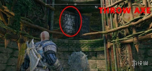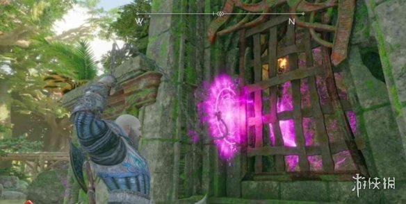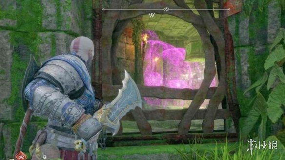 有一把藍色的鎖被藤蔓擋住了,向紫色藤蔓附近射出紫色符文箭,再向旁邊牆壁射一支紫色符文箭,用混沌之刃攻擊,點燃藤蔓,然後用斧子攻擊藍色的鎖即可。