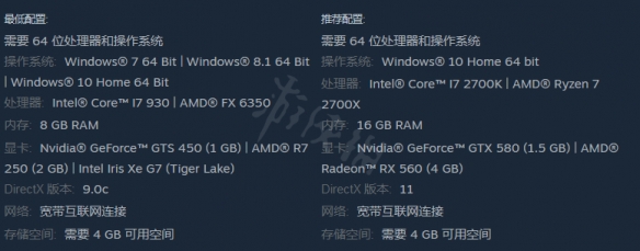 顯卡: Nvidia® GeForce™ GTX 580 (1.5 GB) | AMD® Radeon™ RX 560 (4 GB)。