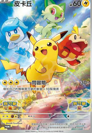 這張皮卡丘的特典卡整體由插畫構成,並且描繪了3隻最初的搭檔,新葉喵、呆火鱷與潤水鴨。要注意此特典僅供實體版玩家可以獲得,數字版將不附贈特典卡。
