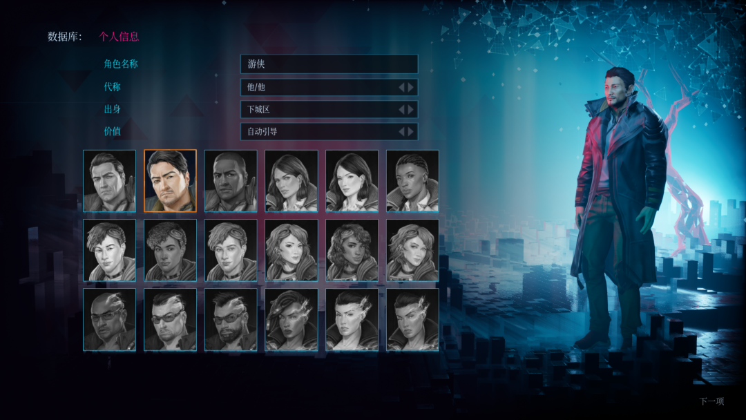在進入遊戲之後,我們首先需要創建遊戲人物。本作的捏人系統並不自由,只為玩家提供了18種預設模型,「出身」選項會影響遊戲中一些劇情的走向,而「價值」則提供了不同的開局屬性點。