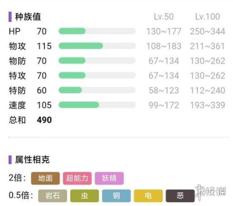 打擊面:指的是有多少個可以打對方200%或以上的屬性,越多越好,其中格鬥和地面最好,都有5個200%,其次是火,冰,岩,為4個200%。