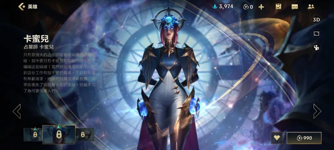 小月點評:崔斯特的此款皮膚是「星域系列」里最炫酷的一款,亦是最貴的一款,與死兆星燼、神王系列、源計劃艾希、歐米伽提莫等皮膚一樣,售價均為990點券,還是對得起這個價格。
