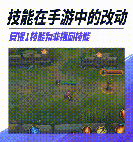 第二位英雄是黑暗之女·安妮,她的Q技能「碎裂之火」在手游中,由指向性技能變為了非指向技能,就是不能鎖定敵方,需要預判釋放。其實這個改動說不上增強或削弱,端游中好選定目標,但手游里不好鎖定釋放,算是人性化改動。