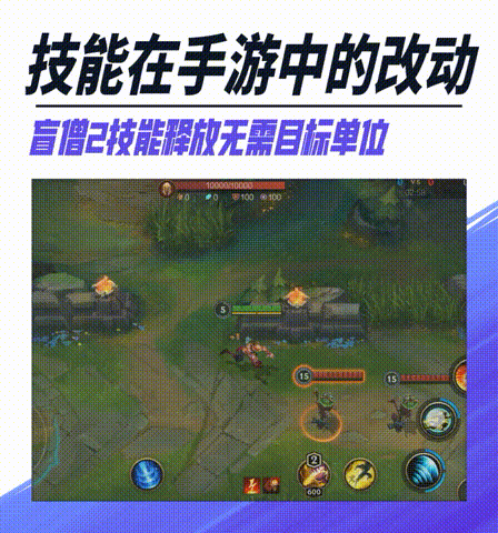 第三位英雄是盲僧·李青,一個在端游操作上限及其高的英雄,他也算是初代被玩家開發出來能使用R閃的人。原本的W技能「金鍾罩」摸眼,被很好的移植到手游中,變成了一個不需要飾品也能自由選擇落地位置的技能。