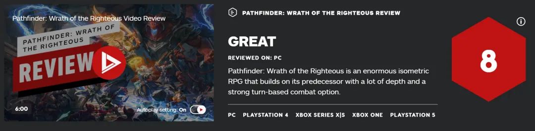 RPG遊戲《開拓者:正義之怒(Pathfinder: Wrath of the Righteous)》早在本月3日就已發售,PC版首周銷量達到了25萬,不過直到今天IGN才發布了該作的評分:8分。