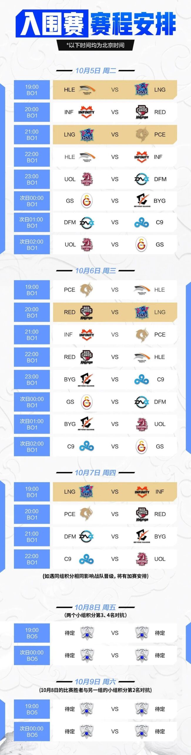 本次S11入圍賽的賽程較此前幾屆全球總決賽的入圍賽賽程縮短了。兩組進行完組內單循環BO1後,積分排名第1的兩隊直接鎖定小組賽名額,兩組的最後一名被淘汰。兩組的第3、4名將進行組內的BO5,兩支獲勝隊分別和另外一組的第2名再進行一場BO5,爭奪最後兩個小組賽的名額。