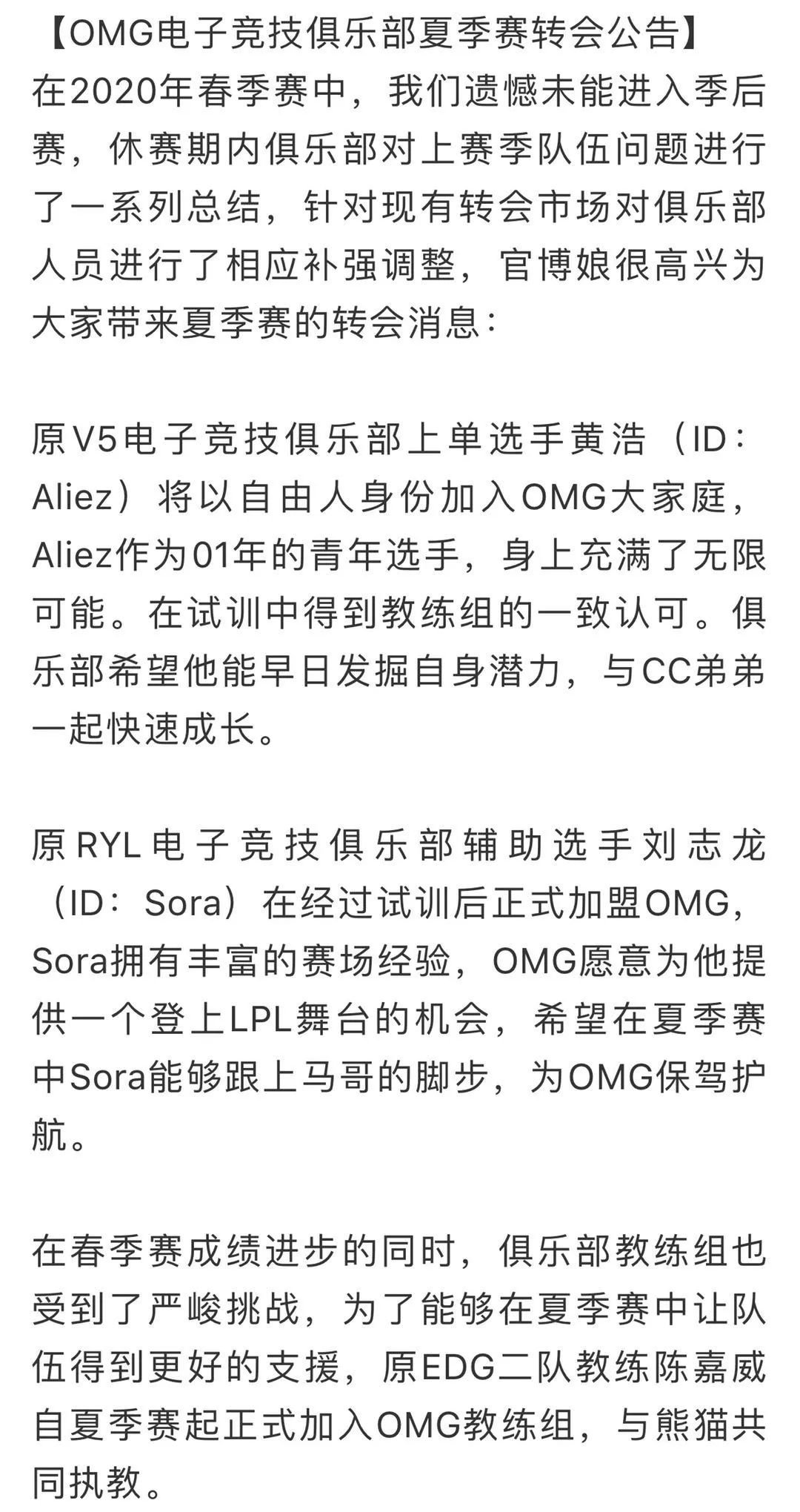 【2020年英雄聯盟職業聯賽(LPL)夏季賽OMG陣容大名單】
