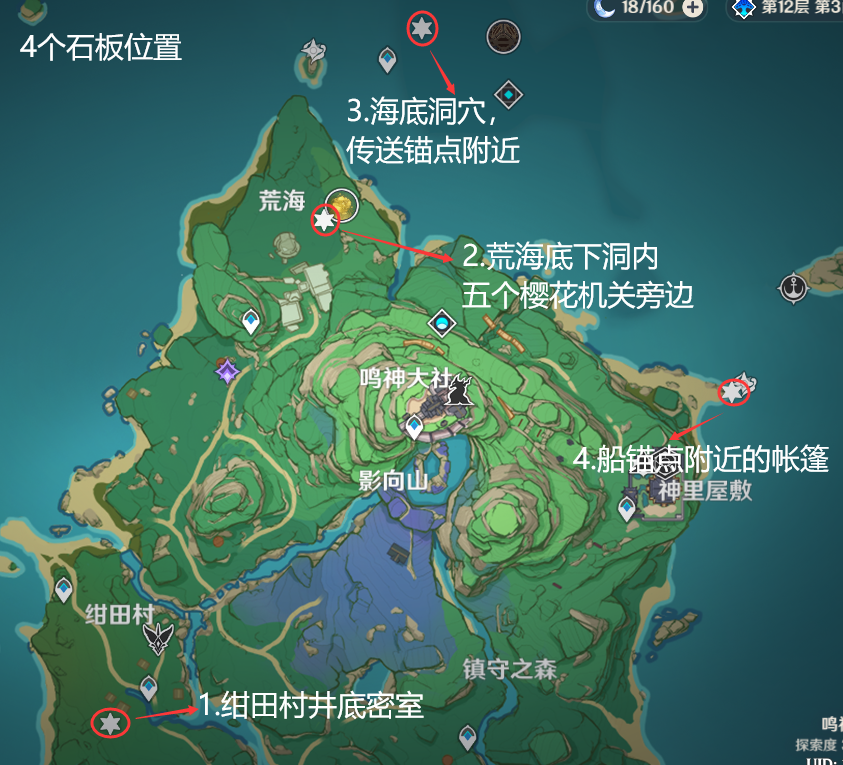 四塊石板的位置如下圖(找到4塊石板後才有任務提示,前面是沒有任何任務提示的),