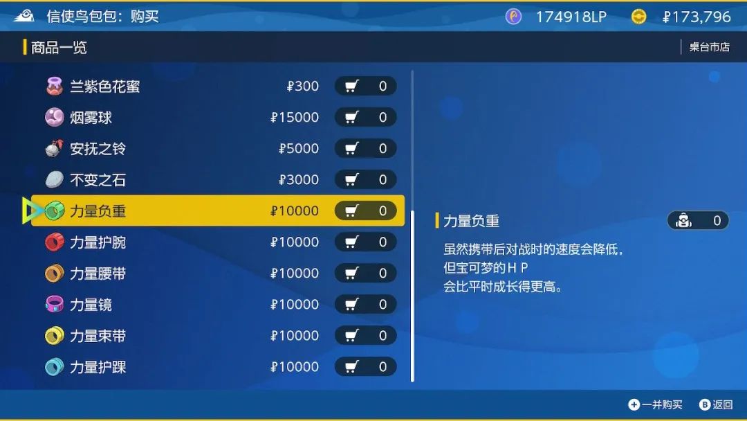 信使鳥包包商店中出售的各種「力量」道具給寶可夢裝備上,每次戰鬥就能額外獲得8點努力值,練滿花的時間非常少。