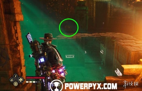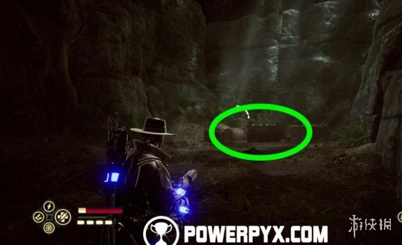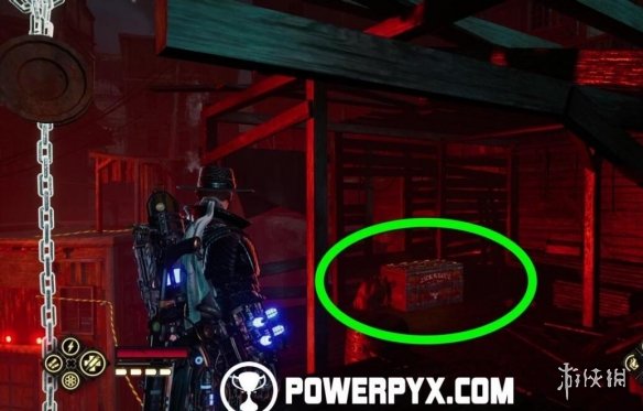 離開馬廄,清理掉敵人後,射擊附近的3個機關開門,然後站在門前,抬頭射擊右上方的機關,將鐵鏈放下來,爬鐵鏈上去就能找到寶箱。