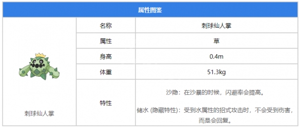 刺球仙人掌是草屬性寶可夢,常用的非官方的譯名是沙漠獸,也被叫做沙漠奈亞。它最愛居住在沙漠,正如它的名字一樣。它和它的進化形夢歌仙人掌並不稀有,它們大量出沒於有沙漠的地方。