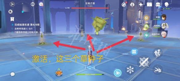 把無相草打至殘血後,用草元素角色激活這三個地方的草種子(用雷元素再激活一下草種子,凈化進度會更快)。