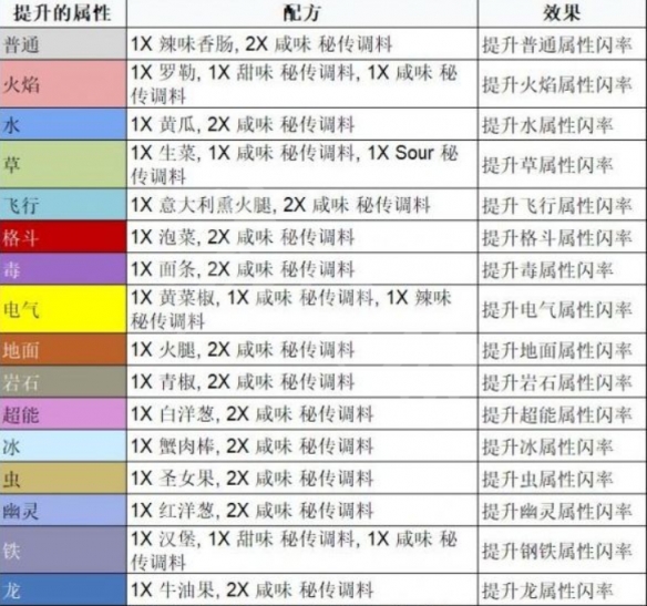 用該配方製作的三明治每小時可閃2-4次。這只是最簡單的配方,當然復雜的也能觸發閃現加成;通過5星太京團戰可以獲得秘制香料;一次只能觸發一個屬性閃現加成,疊加不同閃現加成對多屬性神奇寶貝沒用。