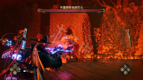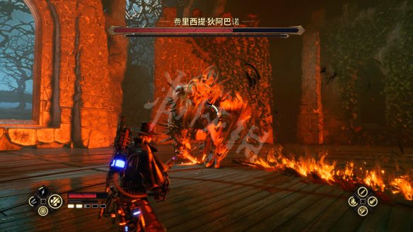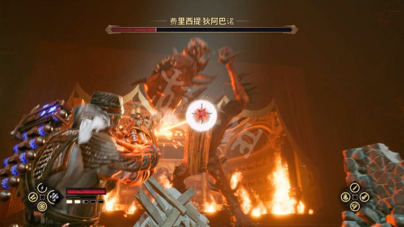 最終Boss 費里西提·狄阿巴諾,戰斗需要完成三階段,一階段沒什麼難點,都是常見的砸地板、衝刺還有捶地衝擊波,熟悉下攻擊節奏為後面做准備。