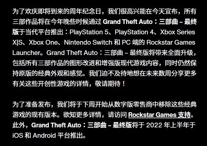 《GTA:三部曲 最終版》將帶來全面升級,包括所有三部作品的圖形改進和增強版現代遊戲內容,同時仍然保持原版的經典外觀和感覺,遊戲將於今年晚些時候登陸PS5、PS4、XSX|S、Xbox One、Nintendo Switch和PC 端的Rockstar Games Launcher,還將於2022年上半年登陸iOS和Android平台。