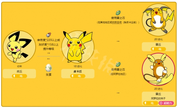 1、進化的形態:皮丘,皮卡丘,雷丘,阿羅拉的雷丘;
